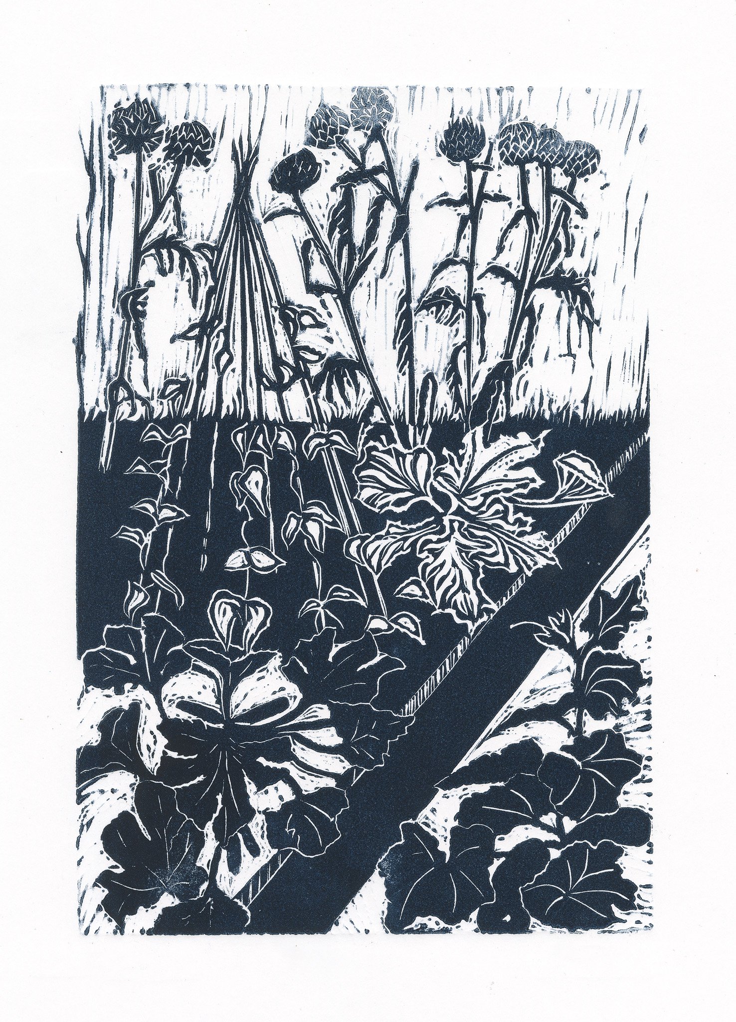 A print inspired by a friend’s vegetable patch and the wonderful shapes of the overgrown courgette plants and the tattered end-of-season artichokes.