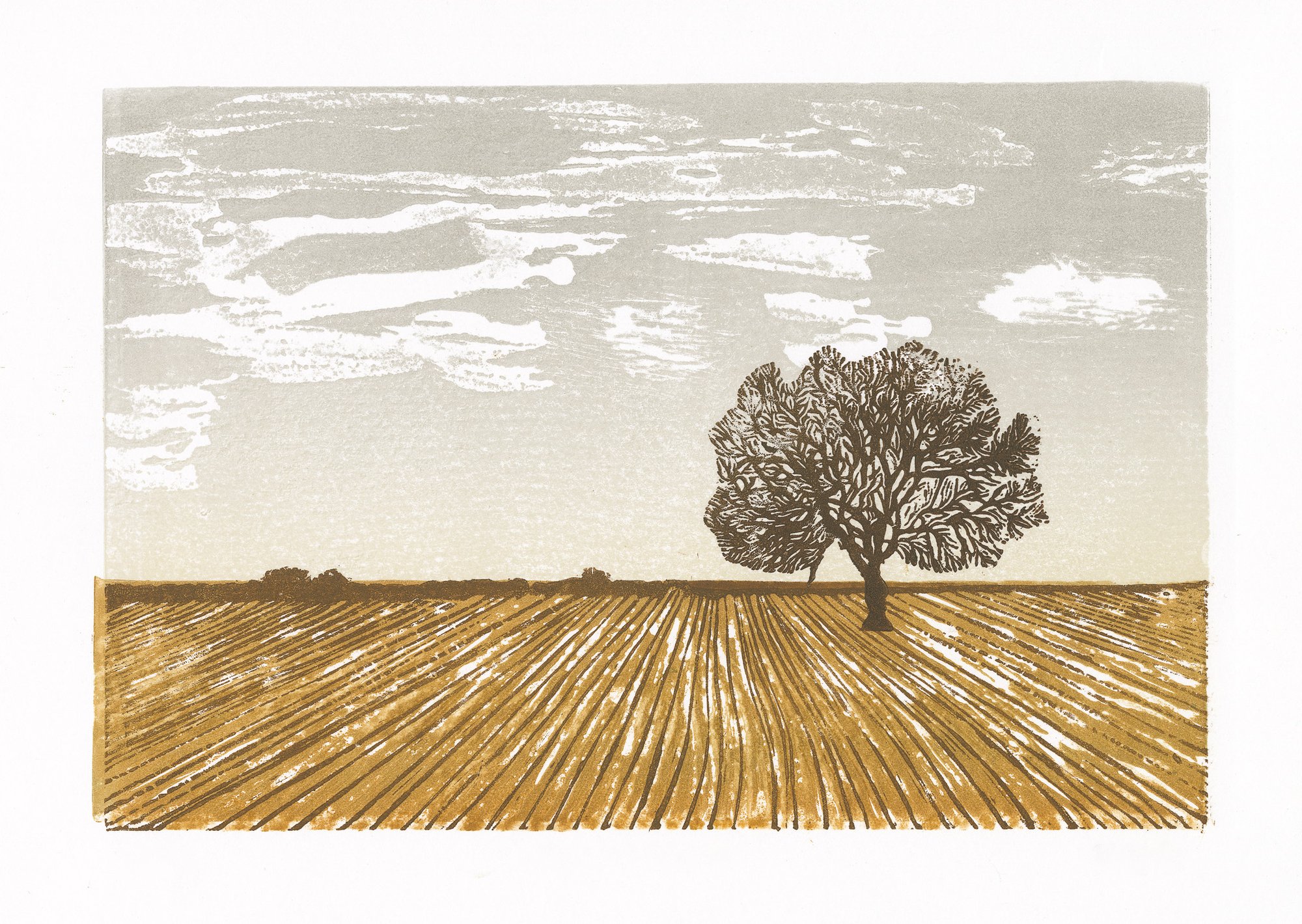 Inspired by a single oak tree in the middle of a ploughed field near my studio on a winter’s afternoon. I’ve tried to capture that wintry, yellow light on the horizon when it's almost dusk by mid-afternoon. It was a joy to celebrate both the fine detail of the tree and the strong lines of the ploughed field.