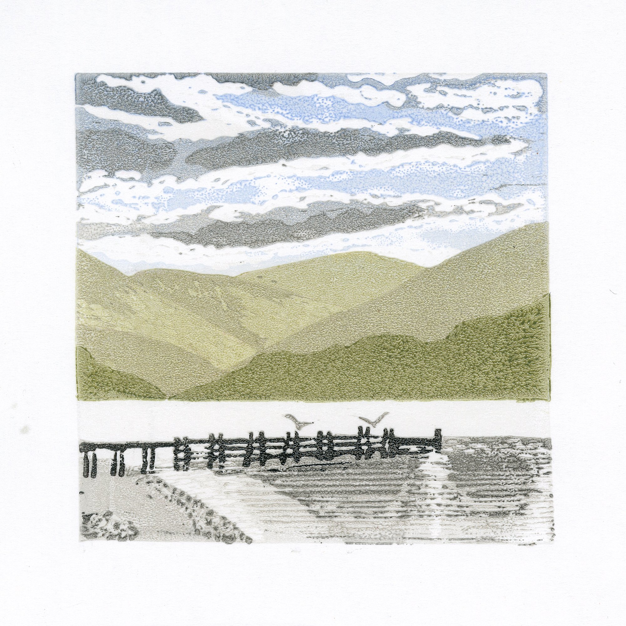 A mini print inspired by a walk along the West Highland Way in Scotland, sketching as the sun was going down behind the mountains on the far shore of Loch Lomond.