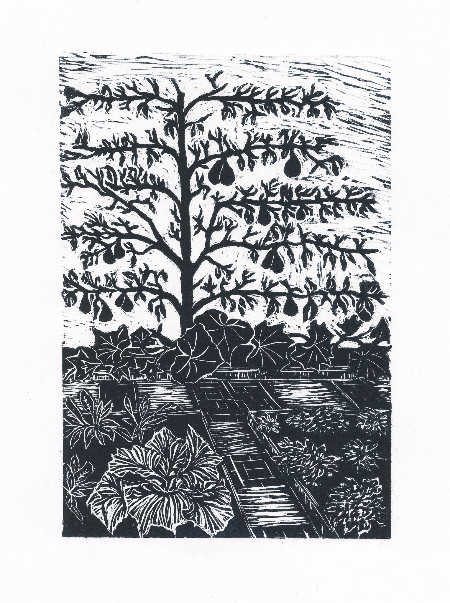 A print of the magnificent pear tree which covers my studio wall and other vegetables from the walled kitchen garden of nearby Audley End house.